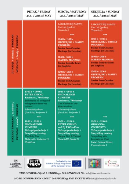 Saturday, May 25th – Our native guest performers are going to narrate stories from Croatian traditional heritage in Croatian to the little ones and their families. There are going to be stories from different parts of Croatia, stories about brave heroes and fantastic creatures. Martin Manasse is going to complement native guests’ performances with his Stories From the Heart, which he is going to present in English and with so much love and devotion that the audience will be taken away into the magical world of storytelling in the blink of an eye.