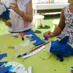 KORAK 2: sada kada imate izrezan lik morskog psa – pripremite kist i vodu za tempere i obojite ga u plavu boju ( ili koju god želite – možda je vaš morski pas neki poseban, čarobni morski pas – haha!). Kad se boja osuši, markerom mu nacrtajte oči.