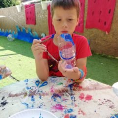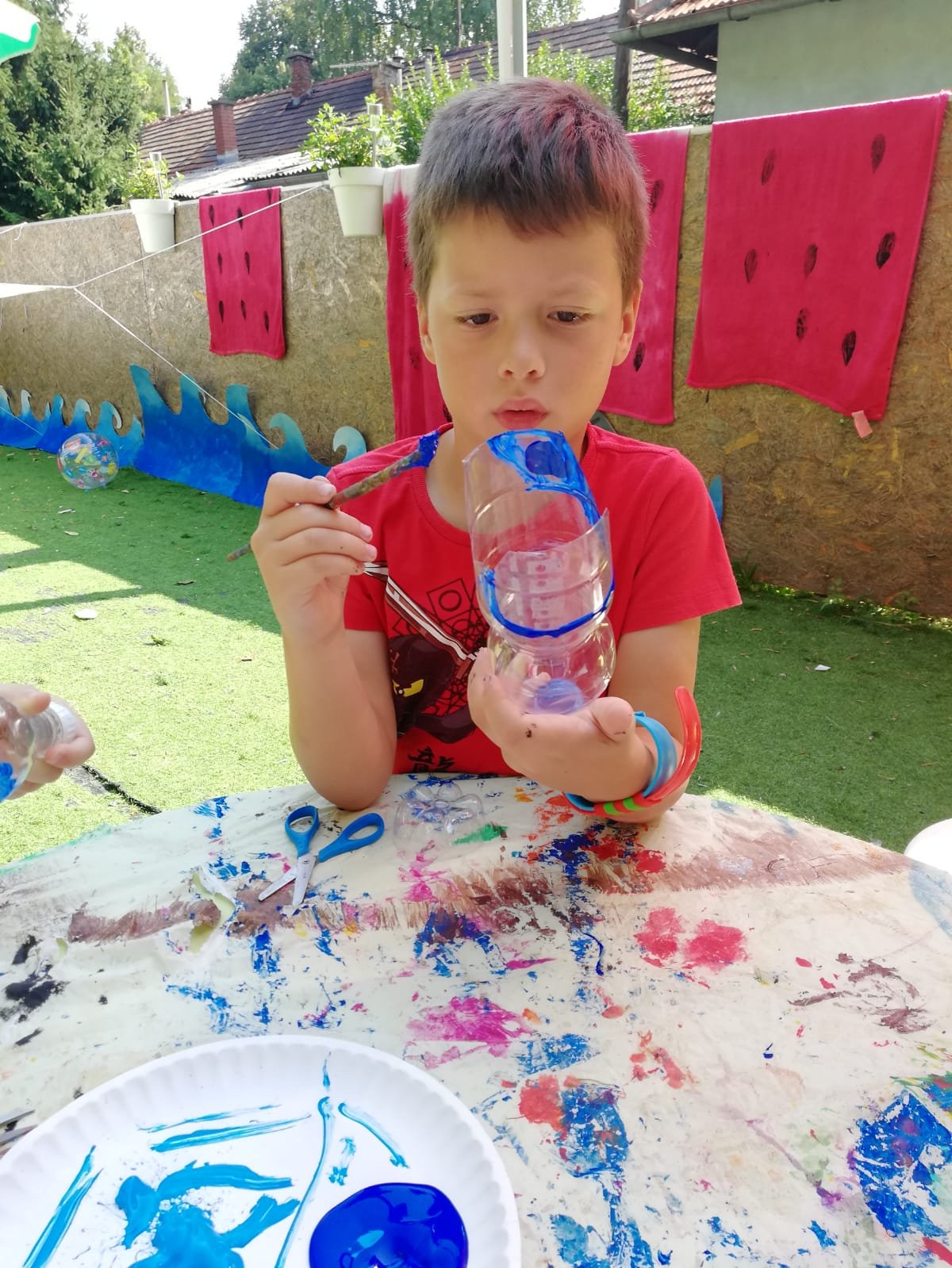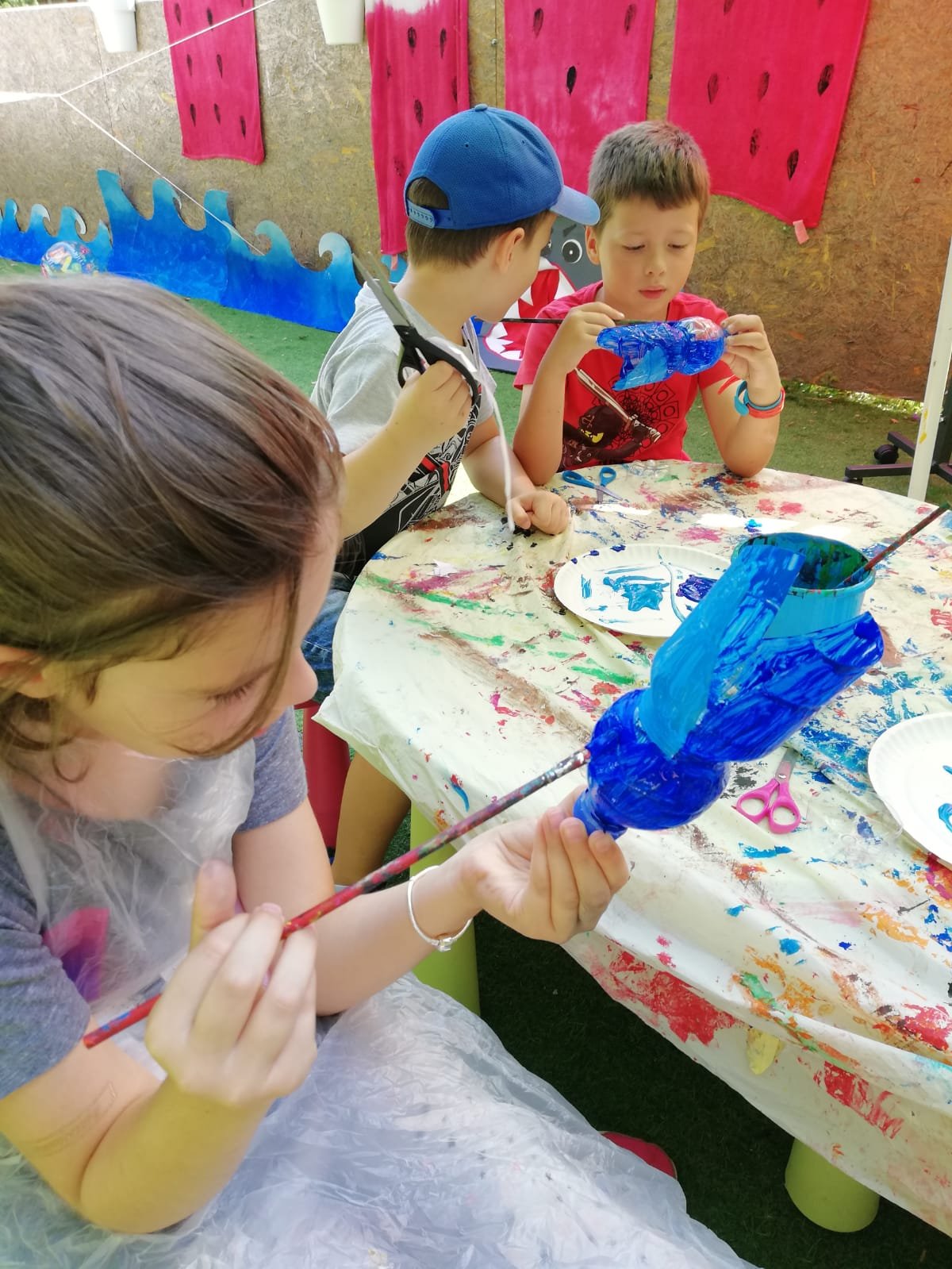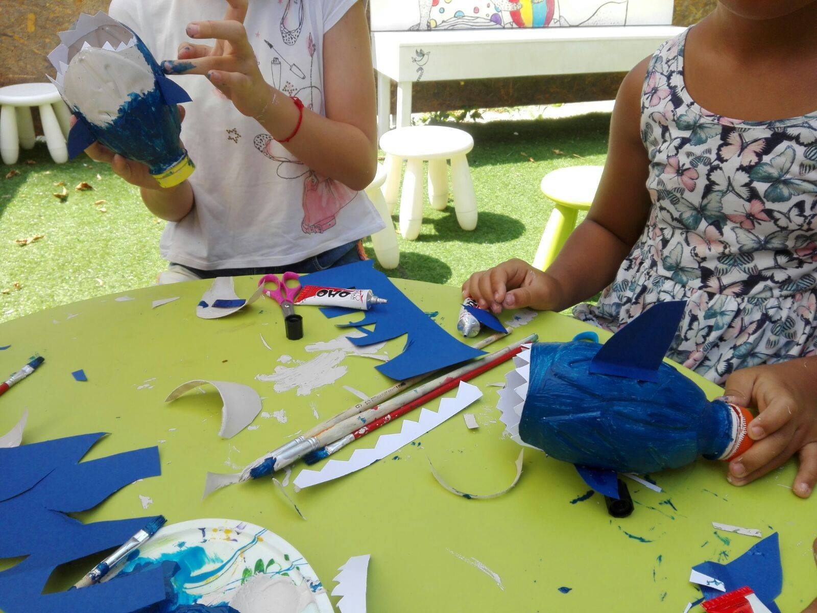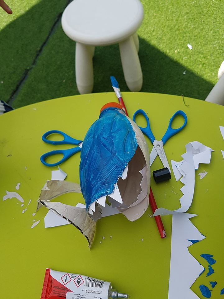 KORAK 3: sviđa vam se što ste do sada napravili ali kao da ste nešto zaboravili? Pa da – morski psi imaju peraje! Iz papira izrežite peraje (2 bočne, repnu i leđnu), obojite ih i zalijepite na plastičnu bocu.