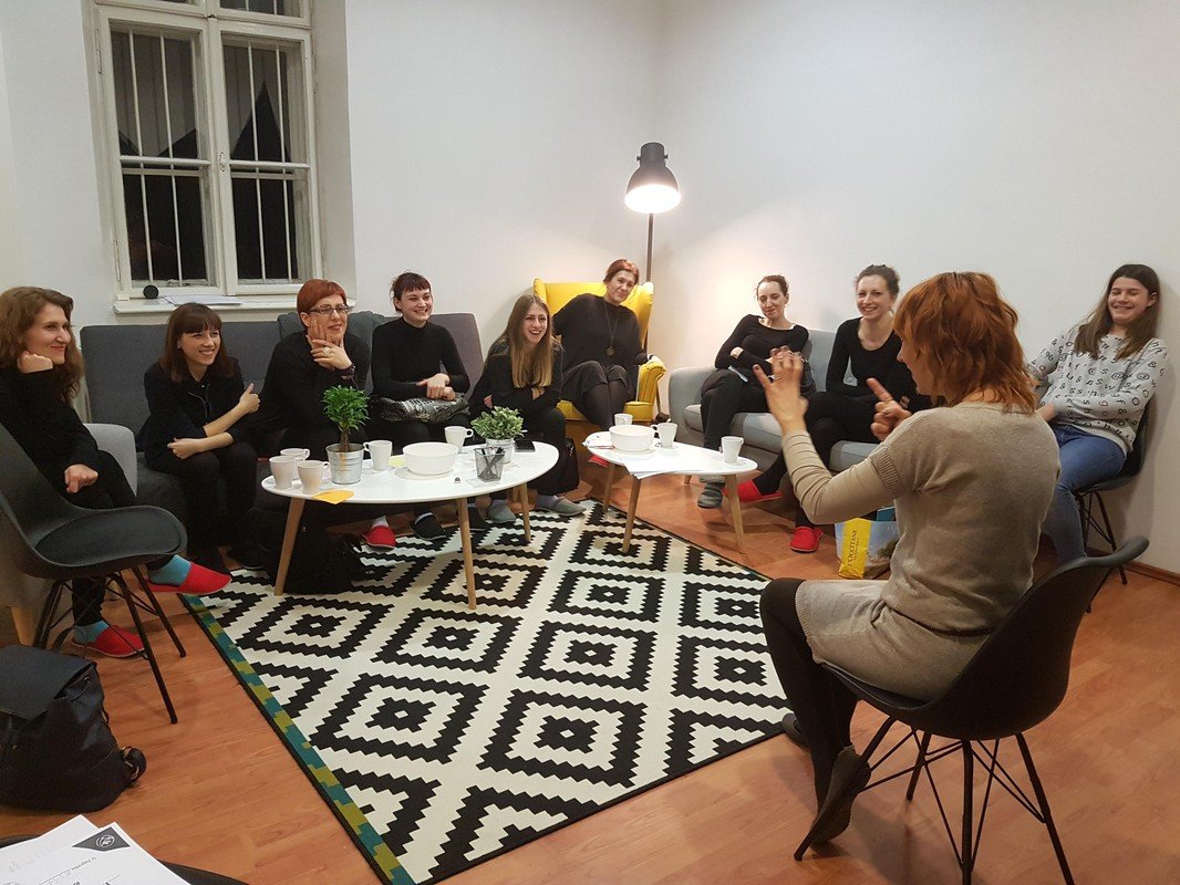 Našu smo učionicu zamislili kao kreativnu dnevnu sobu. Imamo genijalne asimetrične kauče, duboke naslonjače i zgodne jastuke. Slobodno se sklupčajte ili izvalite. Počastit ćemo vas finim keskićima, kolačima ili grickalicama, okrijepiti vas aromatičnim čajem ili osvježiti ukusnim sokom. A onda vam bacati maštu na volju, izazove pred papuče i bube u uši.