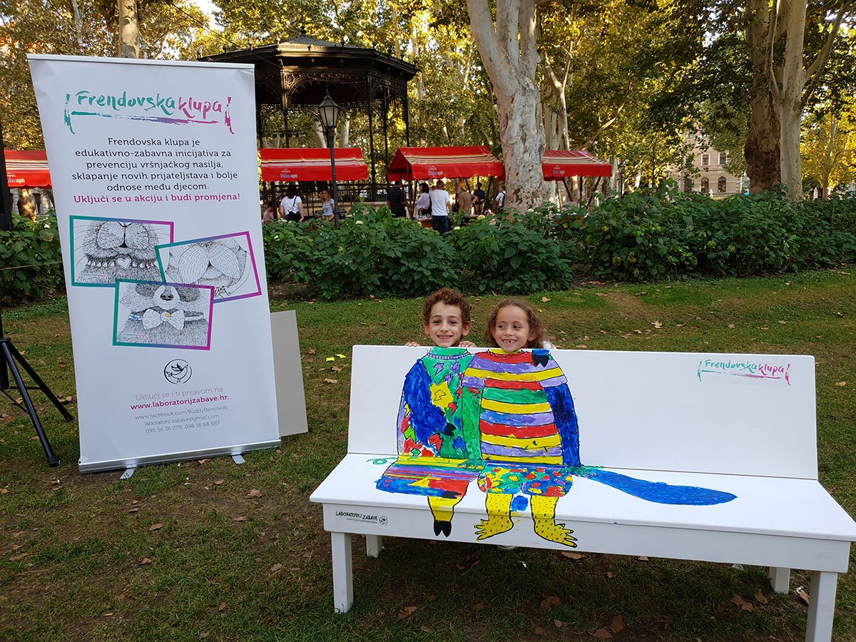 Ekipa Laboratorija zabave osmislila je brdo zabavnih aktivnosti i zadataka s kojima je vrijeme proletilo u tren. Cijelo popodne izrađivali smo, osmišljavali, igrali se i (kao i uvijek!) – učili! Na Multi Kulti punktu upoznali smo simbole mira iz cijelog svijeta, saznali po čemu se pojedine kulture razlikuju (i da je to potpuno ok!) i razgovarali kako pomoći stvaranju zajedničkog života u miru i toleranciji. Igrali smo veeeliku društvenu igru na travi i skakali od polja do polja s ispisanim (pogađate!) pozitivnim porukama. Složili smo se da je svaka pomoć dobrodošla u suzbijanju vršnjačkog nasilja i poticanja mladih na njegovanje prijateljstava. U tom smo tonu i oslikavali Frendovsku klupu i zatim se na njoj naslikavali – jer što su lijepe uspomene s prijateljima ako ih ne sačuvamo zauvijek? Na Zidu lijepih želja ostavili smo poruke, citate i cijele priče pozitivnih i ohrabrujućih želja s nadom u bolju budućnost.
